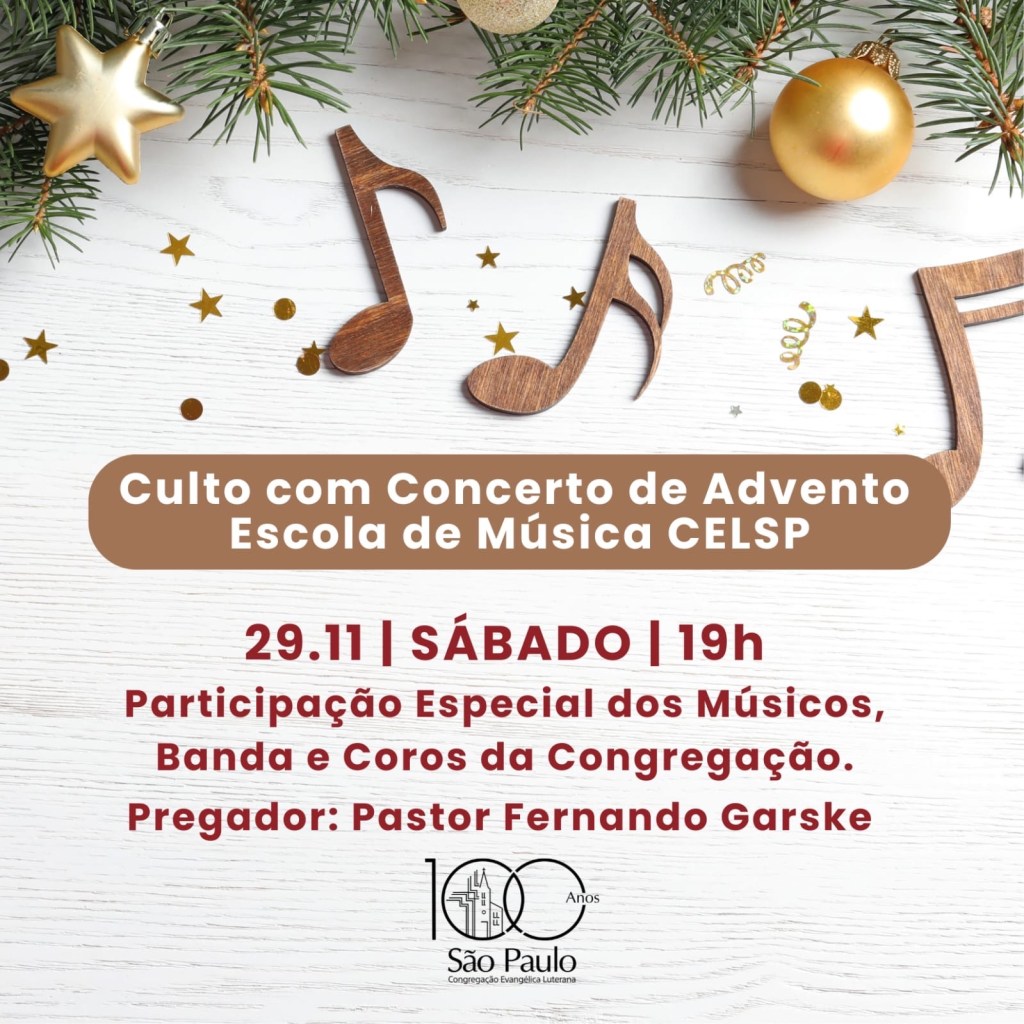 Estamos diante de um novo ano da igreja: O Advento. Esse novo ano da igreja inicia no próximo sábado, dia 29. Como já é tradicional, a Escola de Música da São Paulo participa do Culto e do Concerto de Advento após o Culto.