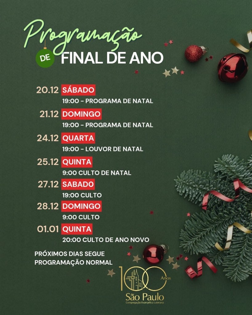 O pastor Carlos estará de férias do dia 02/01/26 até o dia 23/01/26.
