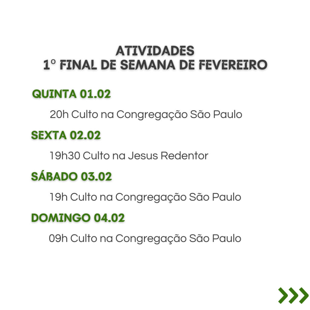 Pastor Marcos Schmidt estará em férias nos períodos de 01/02 a 10/02 e 20/02 a 29/02. Pastor Carlos Kracke estará em férias no período de 13/02 a 19/02.