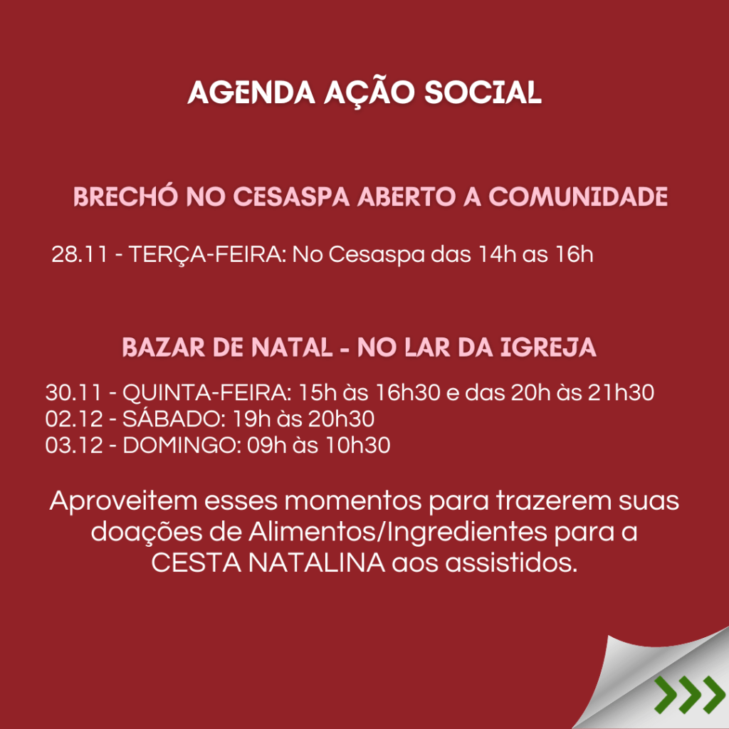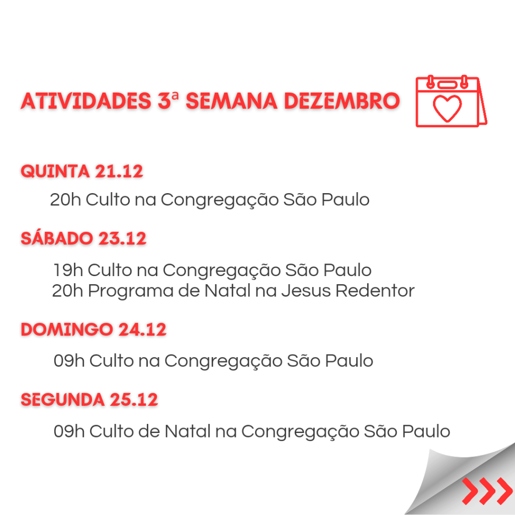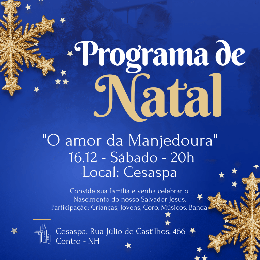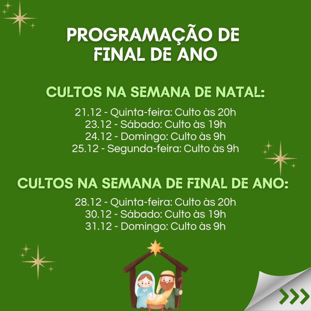 Neste sábado 16.12.23, é o PROGRAMA DE NATAL, e queremos reunir todas as famílias para Celebrar o Nascimento do nosso Salvador Jesus. E para a celebração ser completa, convidamos cada família a trazer um prato de doce ou salgado, para compartilhar. Vamos preparar uma grande mesa de Natal e desfrutar deste momento de comunhão. Contamos com a participação de todos!