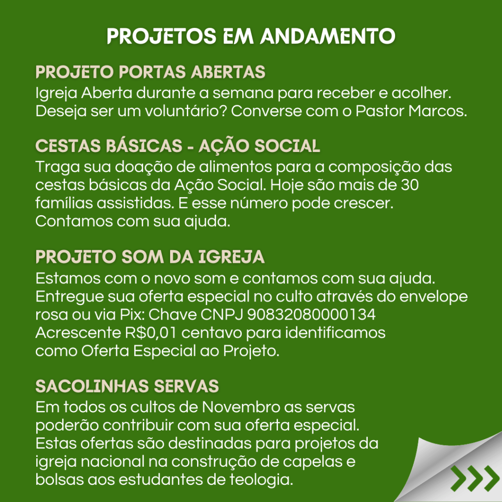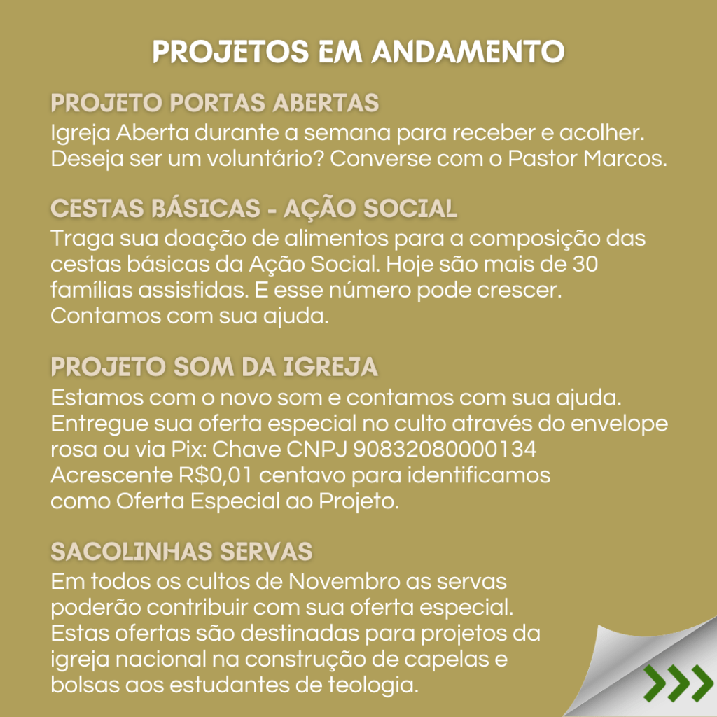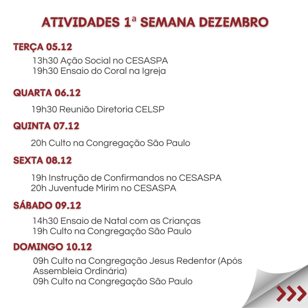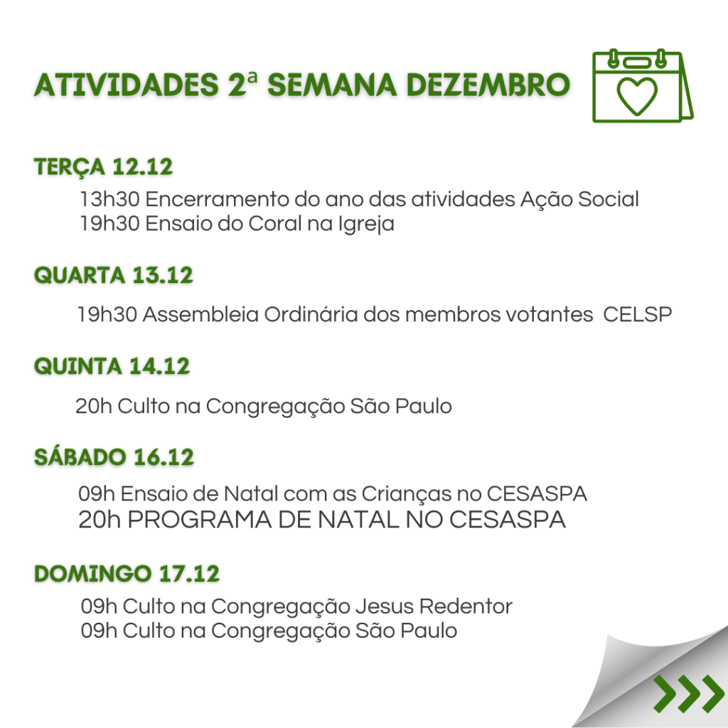 Neste sábado 16.12.23, é o PROGRAMA DE NATAL, e queremos reunir todas as famílias para Celebrar o Nascimento do nosso Salvador Jesus. E para a celebração ser completa, convidamos cada família a trazer um prato de doce ou salgado, para compartilhar. Vamos preparar uma grande mesa de Natal e desfrutar deste momento de comunhão. Contamos com a participação de todos!