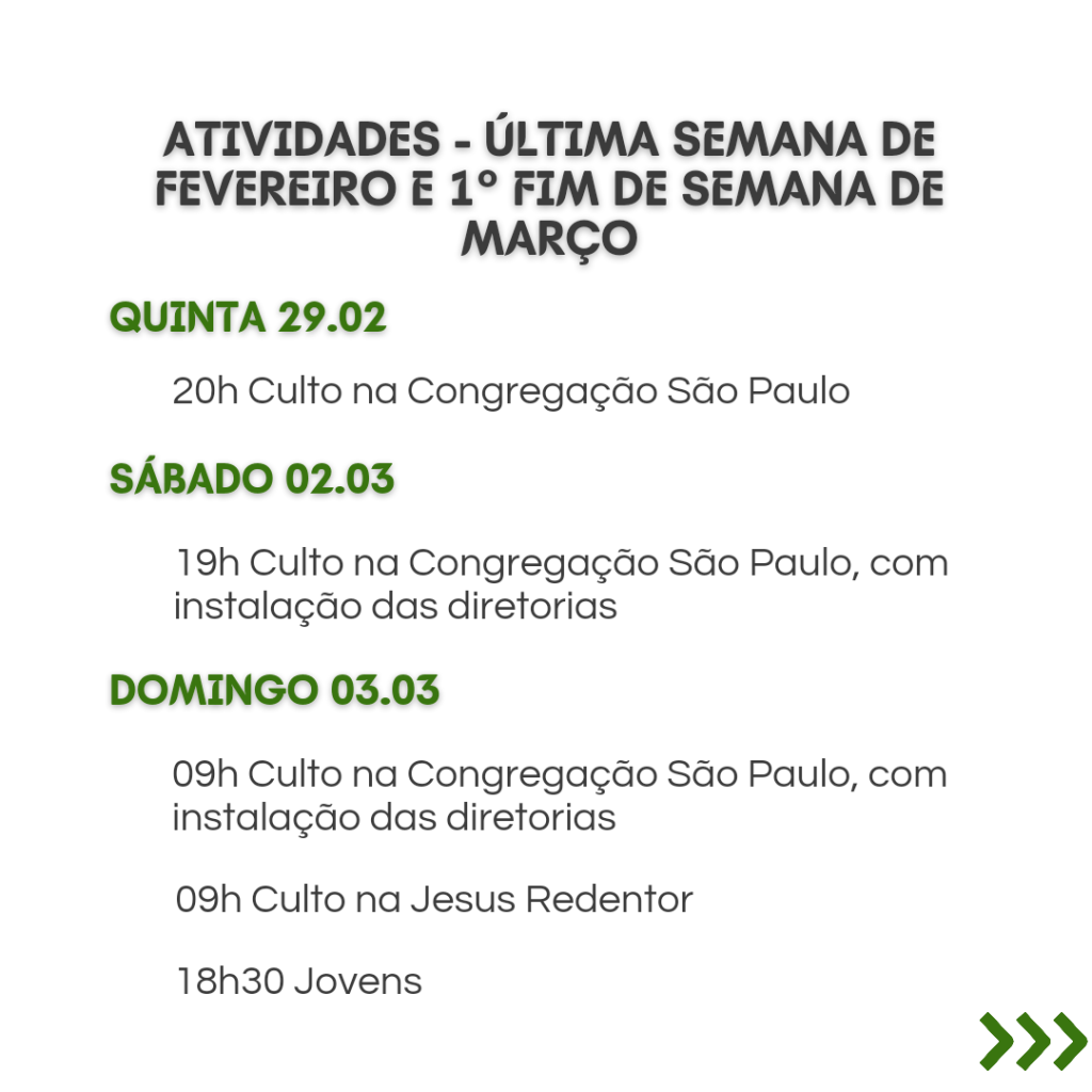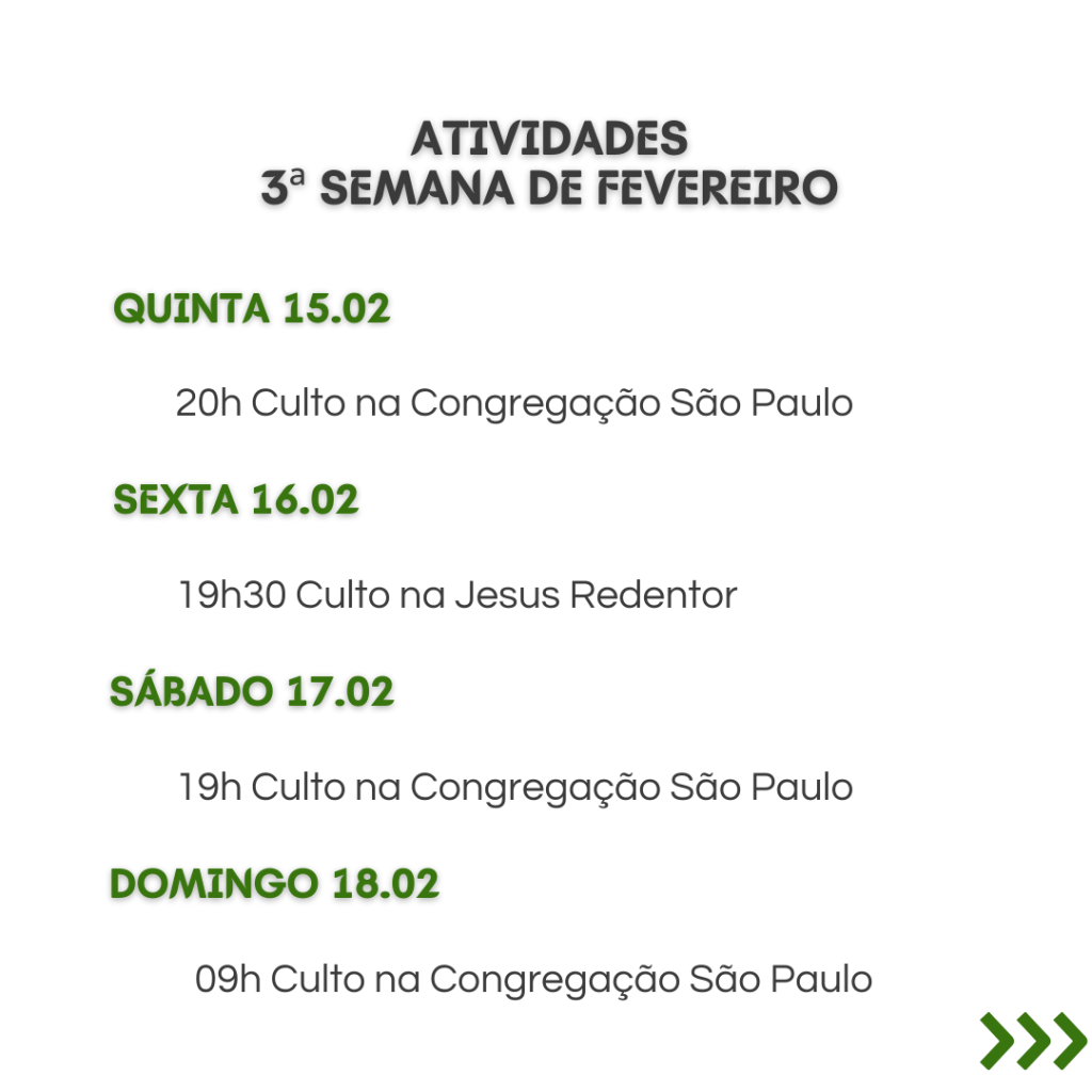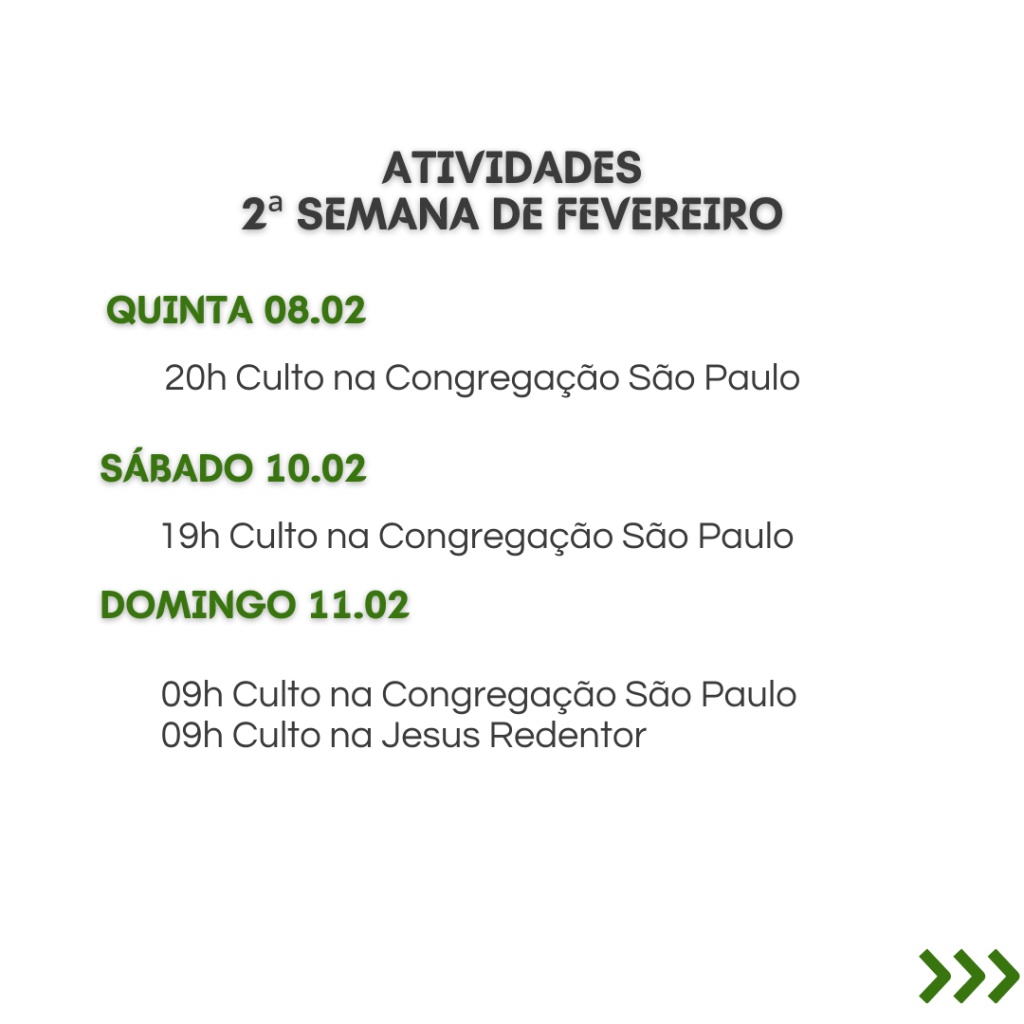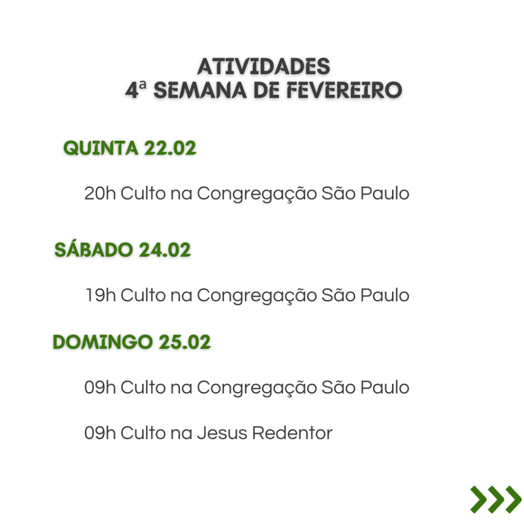 A secretaria vai estar fechada nos dias 12/2 a 16/2, retornando às atividades no dia 19/2. Dúvidas ou necessidades: contatar os pastores.