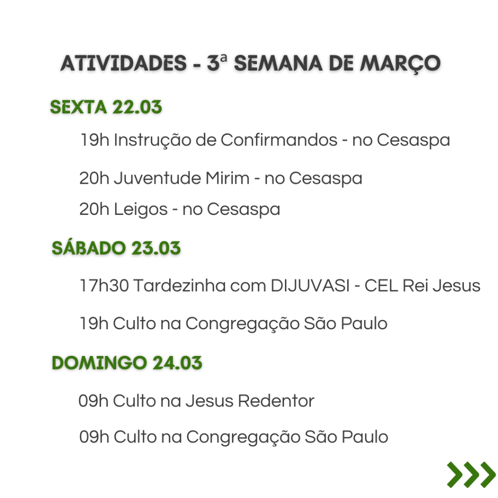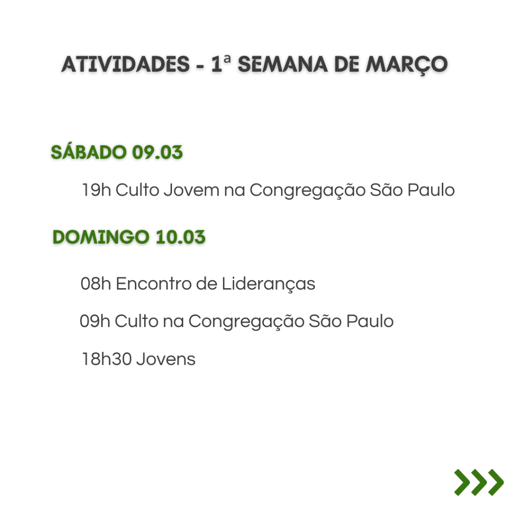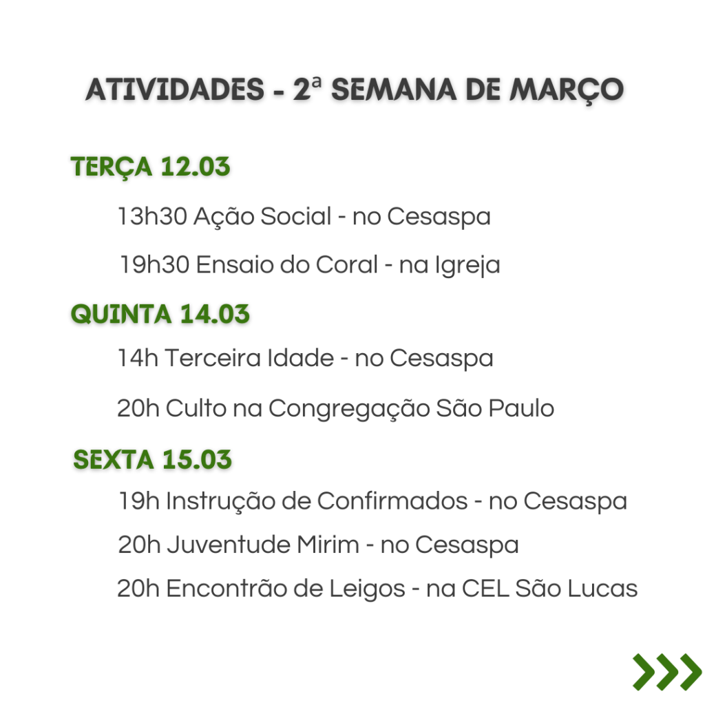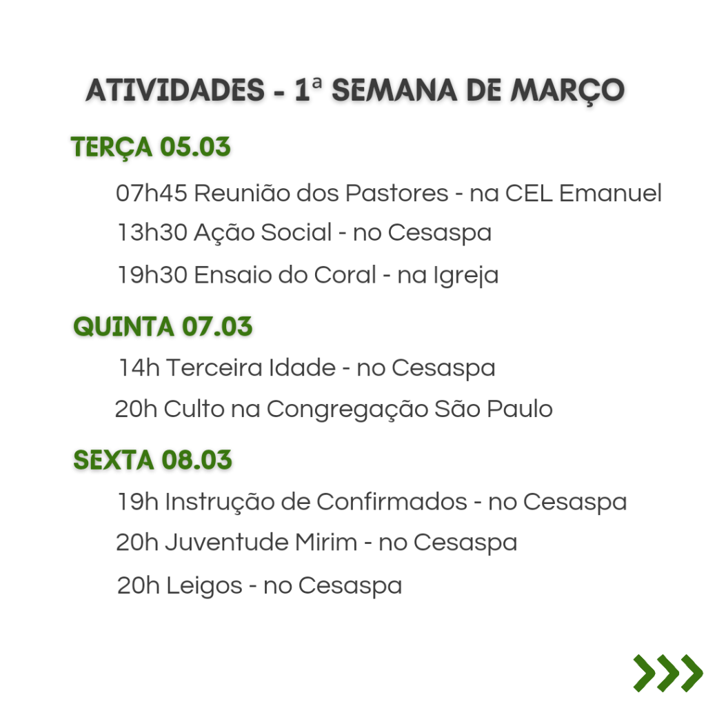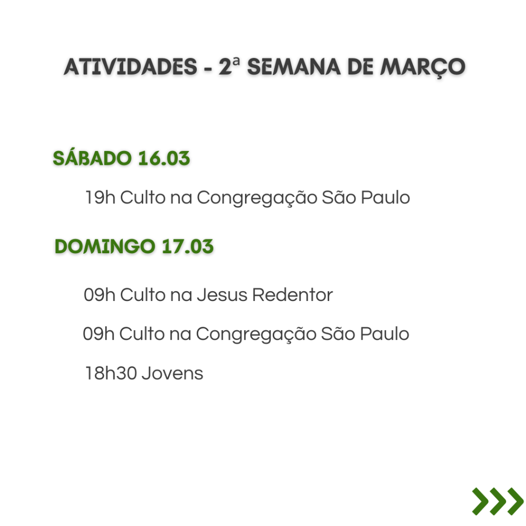 A secretaria vai estar fechada nos dias 12/2 a 16/2, retornando às atividades no dia 19/2. Dúvidas ou necessidades: contatar os pastores.