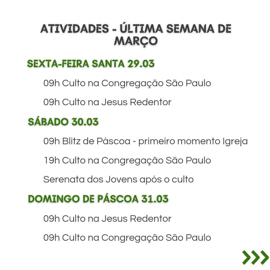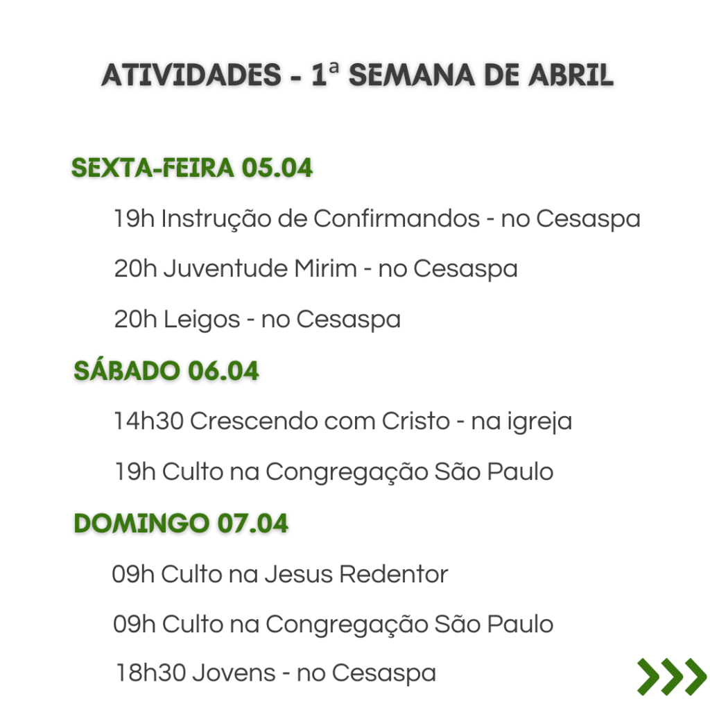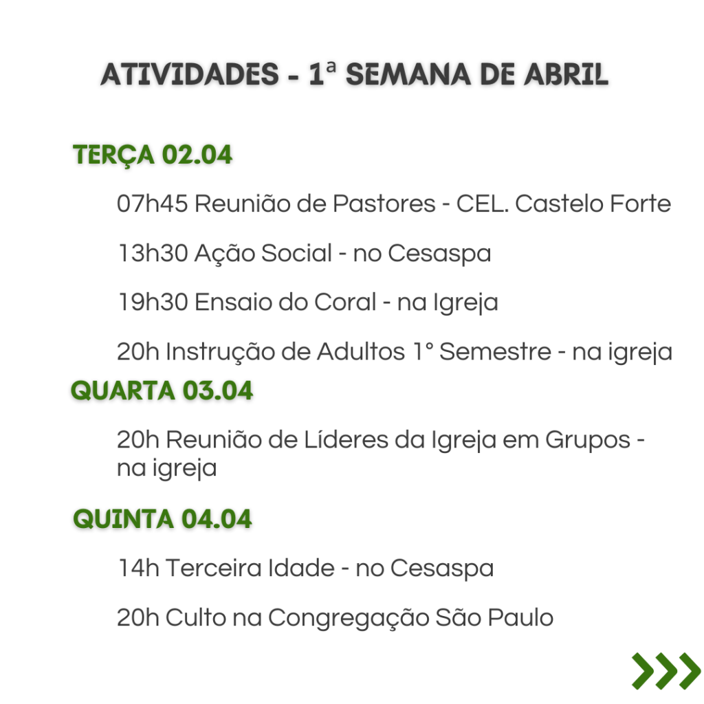 A secretaria vai estar fechada nos dias 12/2 a 16/2, retornando às atividades no dia 19/2. Dúvidas ou necessidades: contatar os Pastores.