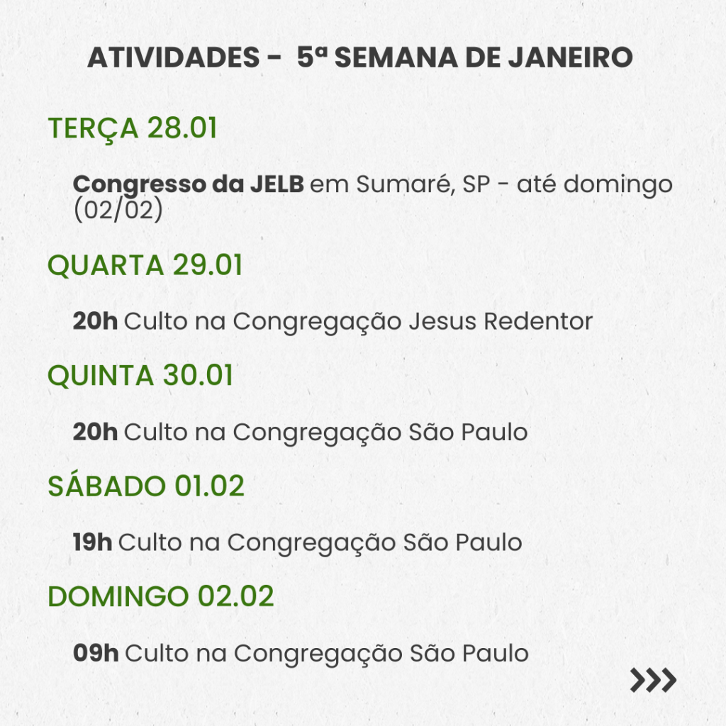 Nos dias 28 de janeiro a 02 de fevereiro aconteceu o 48ª Congresso Nacional da JELB em Sumaré, São Paulo. O Congresso deu inicio às comemorações dos 100 anos de fundação da JELB que será no dia 31 de maio de 2025.