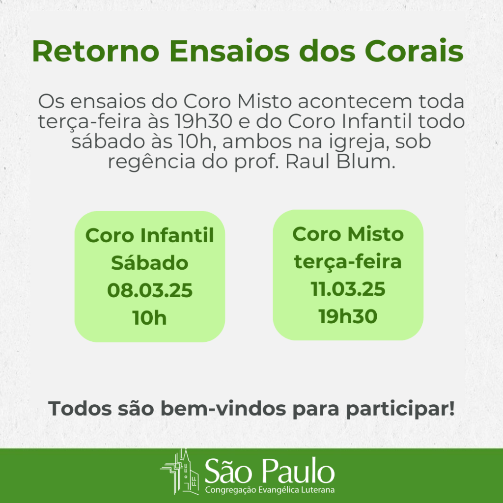 “Lembremos que estamos nos preparando para o Centenário de nossa Congregação. No livro do pastor Carlos Henrique Warth está registrado que, no dia 25 de outubro de 1925 “O coro misto da comunidade, fundado e dirigido pelo professor João Neukuckatz, canto a 4 vozes os hinos ‘Refúgio certo é nosso Deus’, hino de batalha d igreja luterana, e ‘Meu Jesus não deixarei'”. Após 100 anos fazemos um convite especial aos membros para que integrem o coro misto da comunidade para celebrarmos um centenário de bênçãos.