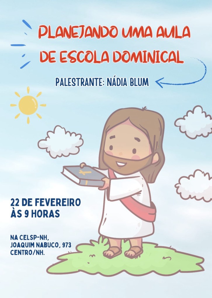 Na manhã do dia 22, teremos um curso ministrado pela prof. Nádia Blum para todos aqueles que gostariam de conhecer como se dá a preparação de uma aula de Escola Dominical e, principalmente, àqueles que têm vontade de se tornarem profs ou auxiliares da ED.