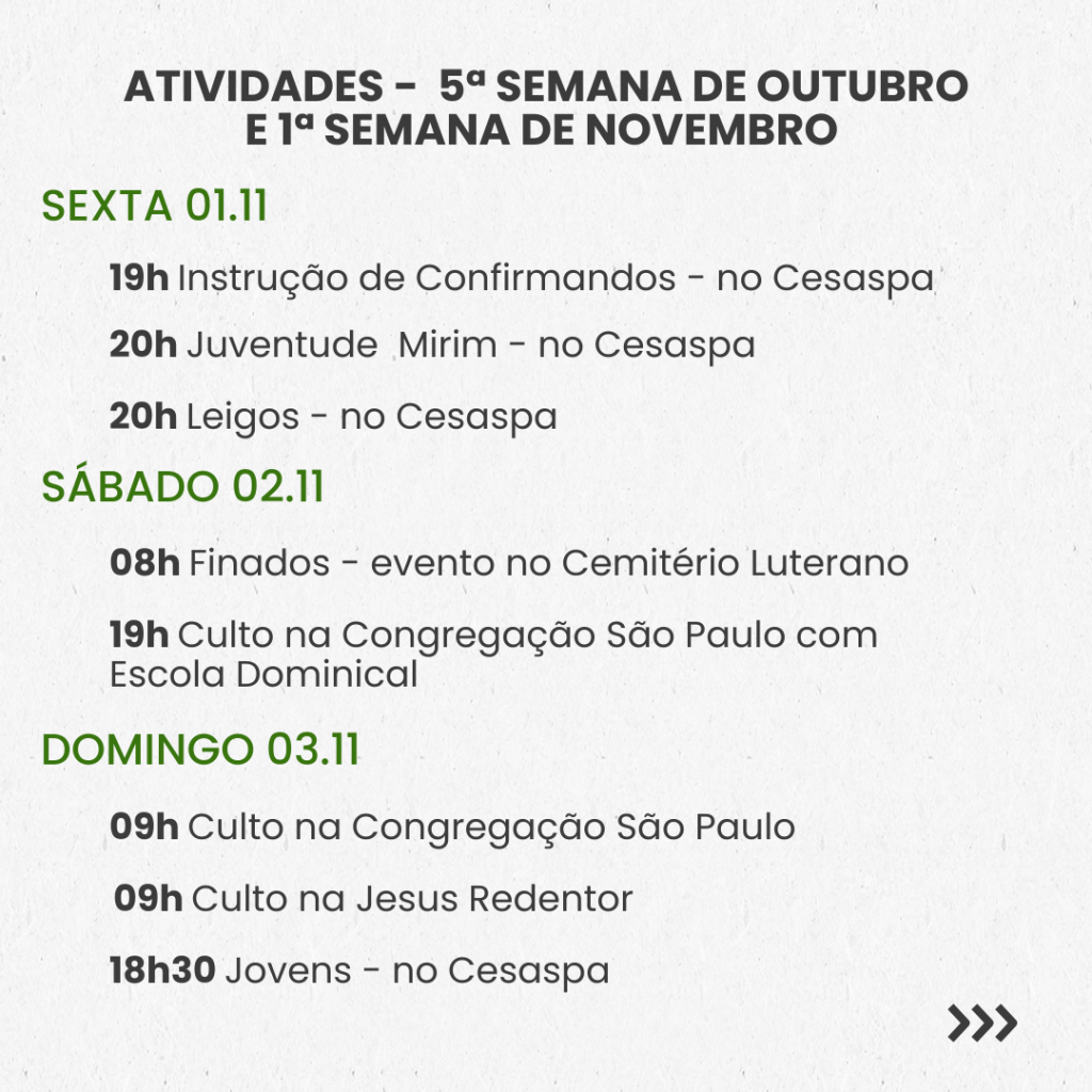 Semanal – 5ª SEMANA DE OUTUBRO E 1ª SEMANA DE NOVEMBRO