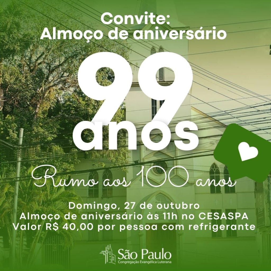 Estamos preparando um almoço especial para comemorarmos os 99 anos da nossa querida comunidade. Não perca!