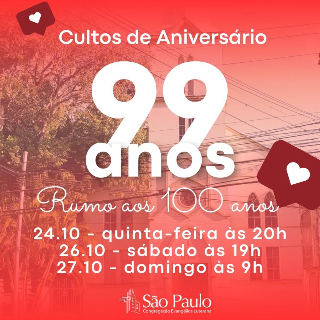 Os cultos do fim de semana do aniversário da comunidade serão especiais para comemorar os 99 anos da nossa querida comunidade. Não perca!